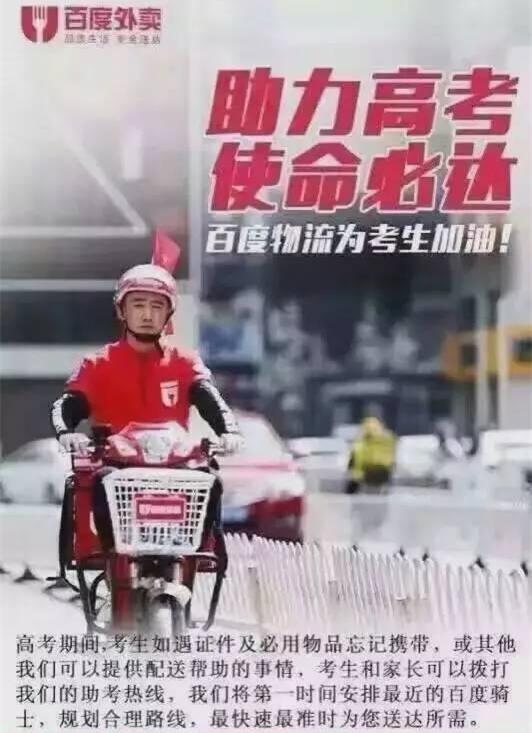 正如歷年來推行的高考愛心專車,百度外賣抓住了高考期間的痛點,而自身恰好擁有解決痛點的方法,于是在這重要的兩天里,百度騎士們仿佛就是為高考而存在的群體,讓百度外賣成功地融入熱點。