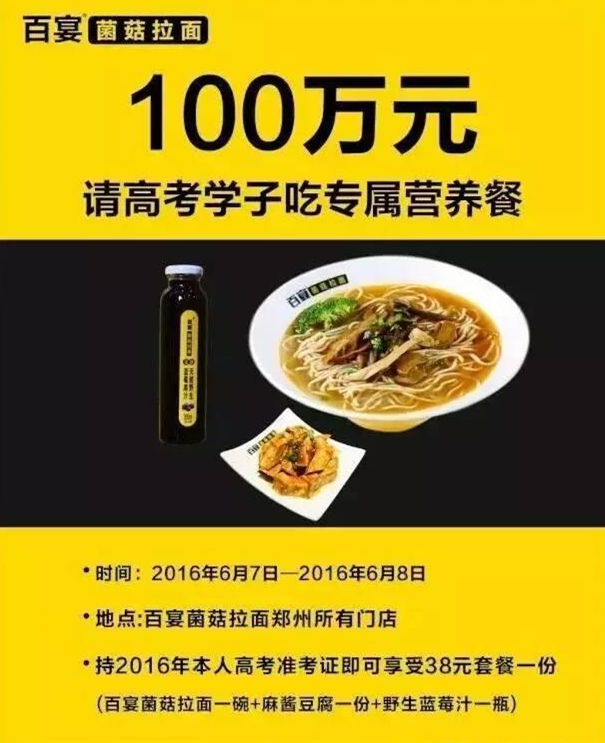 正如今年“高考”期間,鄭州的百宴菌菇拉面為了助力高考學(xué)子能在考試期間獲得足夠的營養(yǎng),特別制定和搭配了高考學(xué)子專屬的營養(yǎng)套餐。據(jù)說這種營養(yǎng)的王牌搭配,能夠充分滿足考生的營養(yǎng)需求,還能長時間保持充沛體力,為此能讓考生以最佳身體狀態(tài)參與重要“戰(zhàn)役”。