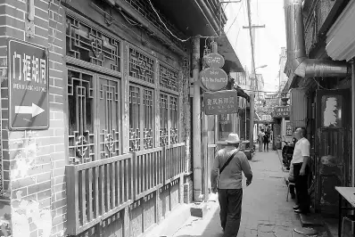 現(xiàn)在的游客慕名前往大柵欄,但很少有人特意去逛一逛門框胡同。老北京民諺有一句——“東四西單鼓樓前,王府井前門大柵欄,還有那小小門框胡同一線天”。如今,與修葺一新的大柵欄商業(yè)街相比,隱藏在繁華背后的門框胡同顯得蹩腳了很多?!耙痪€天”還在,但是屋檐上爬滿了油煙落下的黑灰。常年沒人打理的雜亂電線,把“一線天”分割成不規(guī)則的形狀。