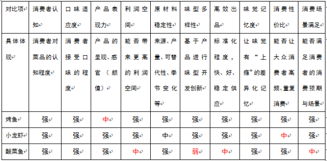 2、烤魚、小龍蝦、酸菜魚三者的橫向?qū)Ρ龋◤?qiáng)/中/弱)