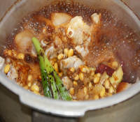 6、將煮過的豬腳撈出,用涼水沖洗至涼,放入高壓鍋中。再將泡好的黃豆撈出,沖洗干凈后也放入高壓鍋中。再放入蔥、姜、干紅椒、山楂,加入適量水,水量約沒過食材底部即可。點火,大火煮開。