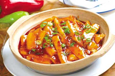 1.炸茄餅茄子3O0克,肉末IOO克,雞蛋三枚,蔥花、姜末各適量。先將茄子洗凈去皮,切成直徑3厘米長的夾刀片(第一刀切斷,第二刀相連);肉末內(nèi)加黃酒、精鹽、蔥、姜與味精,攪拌均勻;雞蛋去殼打碎,投入于淀粉調(diào)成糊,茄夾肉撒少許干淀粉后,將向末放入做成茄餅;鍋內(nèi)放油燒至六成熱時(shí),茄餅掛糊,逐個(gè)下鍋炸至八成熟時(shí)撈出,待油溫升到八成熱時(shí),再將茄餅放入復(fù)炸,至酥脆出鍋,撒上椒鹽末即成。此菜香脆可口,具有和中養(yǎng)胃作用,胃納欠佳,食欲不振者尤宜服食。