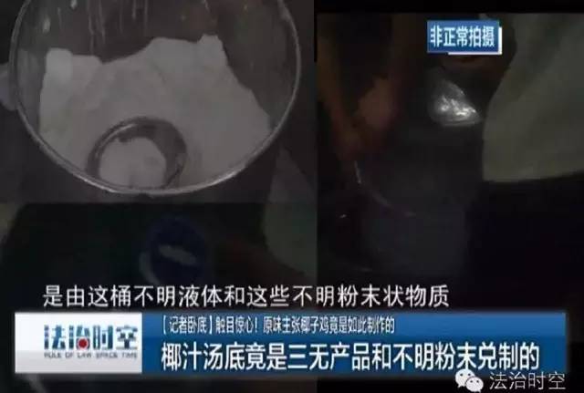 這家原味主張椰子雞是全國連鎖的餐飲品牌,在深圳就有著近30家分店,是深圳椰子雞門店最多的餐飲品牌,并號稱入選了博鰲亞洲論壇國宴!廣告中號稱純正椰汁的鍋底竟然是三無產(chǎn)品和不明粉末兌制的。為了讓椰子雞更有椰香味,廚工會在鍋里和盤里放些椰肉。而這些椰肉是早已切好的已經(jīng)發(fā)酸的配送的椰肉。