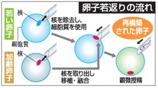 卵子回春法俗稱第四代試管嬰兒(或稱三人試管嬰兒),通過取出老化卵子的核,融入到年輕女性已去除卵子核的細(xì)胞質(zhì)當(dāng)中,以老化卵子的基因加上年輕卵子的細(xì)胞質(zhì)來合成新的卵子,從根本上提高大齡女性的妊娠率。在這個(gè)研究領(lǐng)域,各國的分子細(xì)胞學(xué)專家們在嘗試不同的置換方法。