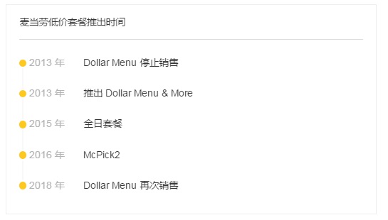 從 2018 年 1 月 4 日開始,麥當(dāng)勞將在全美提供 1 美元、 2 美元、 3 美元菜單。 1 美元包括任意大小的軟飲料與吉士漢堡; 2 美元菜單則包括小杯 McCafe 飲品與培根雙層牛肉漢堡;而開心樂園餐與三層吉士漢堡則屬于 3 美元菜單菜品。